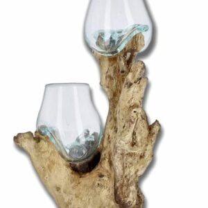 Double vase en verre soufflé posé sur une racine de Teck – LAMA