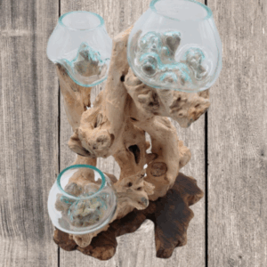 Triple vase en verre soufflé posé sur une racine de Teck – LUNA