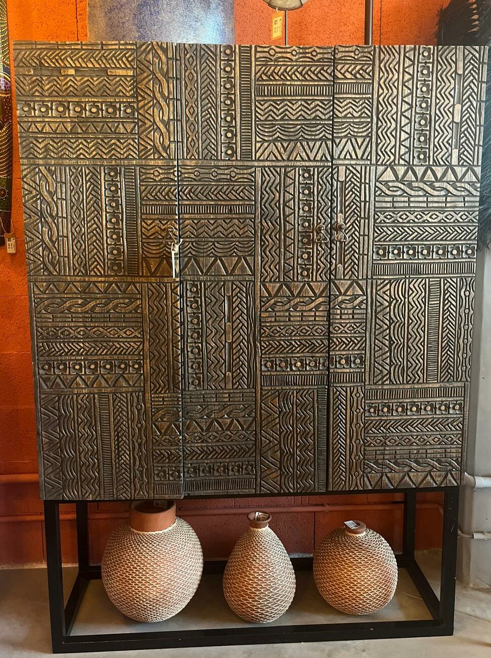 Apportez une touche de mystère et de luxe à votre intérieur avec cette armoire en teck de Bali. Tout d’abord, ce meuble imposant se distingue par ses façades richement travaillées, mêlant gravures tribales et finitions dorées sur un fond noir profond. En effet, chaque pièce est issue d’un travail artisanal fait main réalisé par nos artisans balinais avec une précision artistique remarquable.