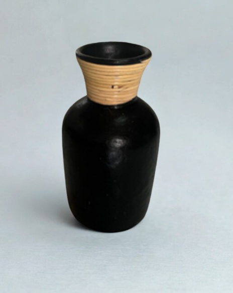 Découvrez cette belle jarre en terre cuite noire, où l’élégance brute de la terre rencontre la chaleur naturelle d’une finition en bambou sur le haut.