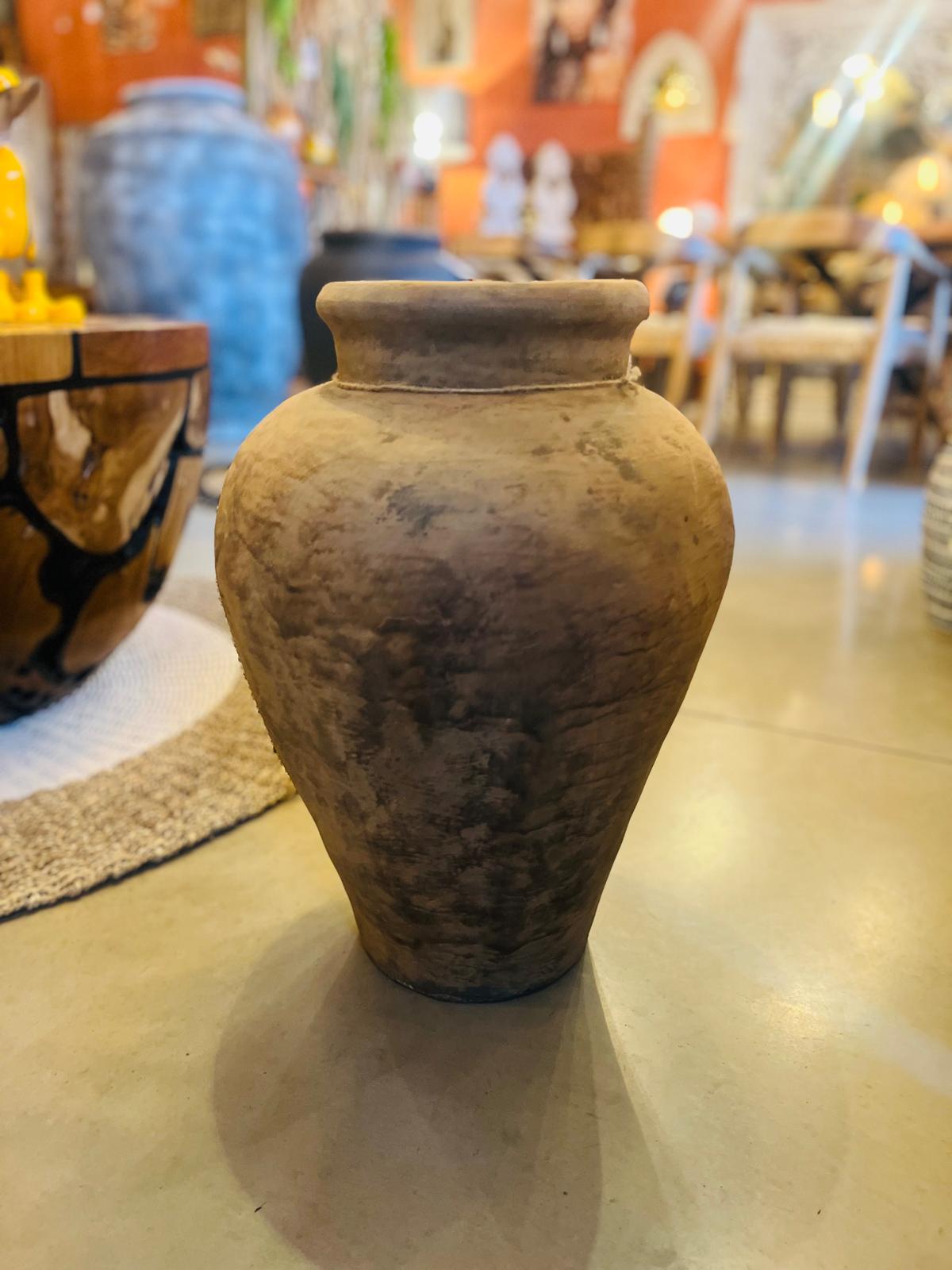 Découvrez l’élégance brute de cette belle jarre en terre cuite, parée de nuances chaleureuses de marron et de jaune.
