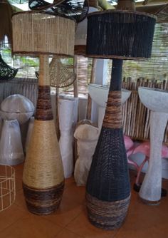 Adoptez ces magnifiques lampadaires en feuille de bananier, véritables pièces maîtresses à la fois authentiques et élégantes. Leur silhouette élancée et leur tressage artisanal, jouant sur des contrastes de couleurs (clair/foncé), apportent une chaleur naturelle et une lumière tamisée pour une ambiance ethnique chic dans votre intérieur.