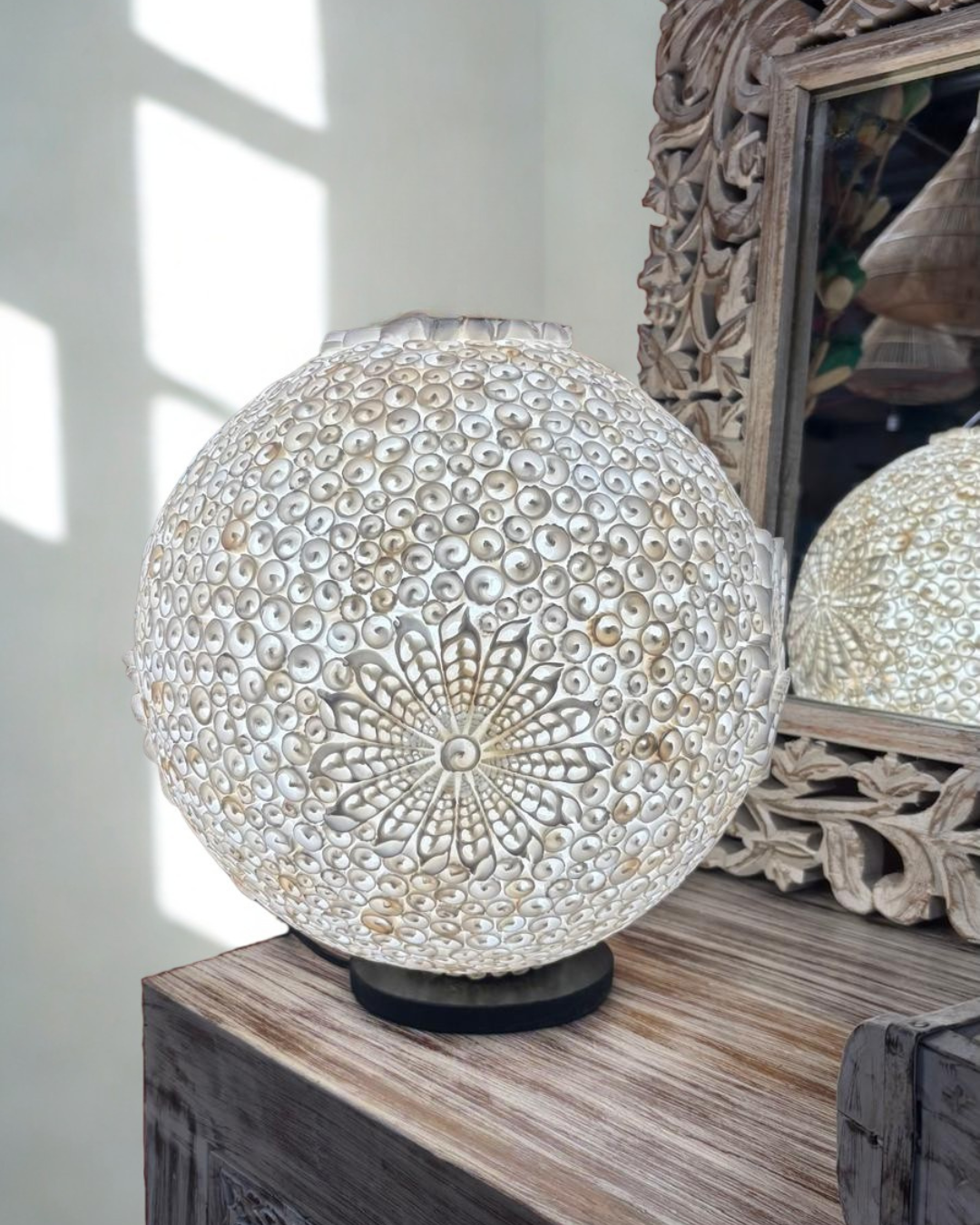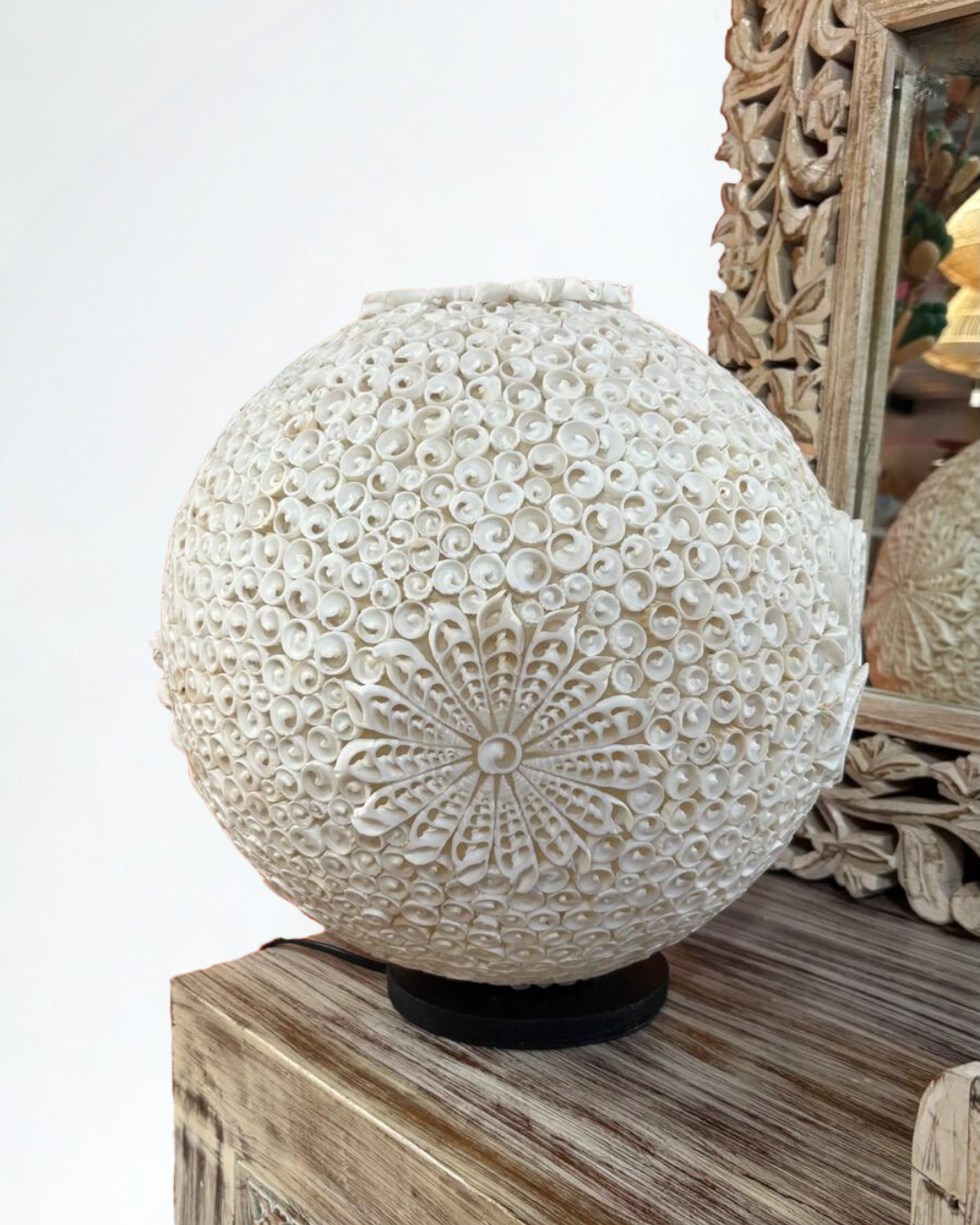 Succombez au charme de cette lampe à poser en coquillages, une pièce à la fois élégante, authentique et résolument originale. Les délicats coquillages, minutieusement arrangés, diffusent une lumière douce et chaleureuse, créant une ambiance unique et poétique qui évoque la beauté naturelle des rivages.