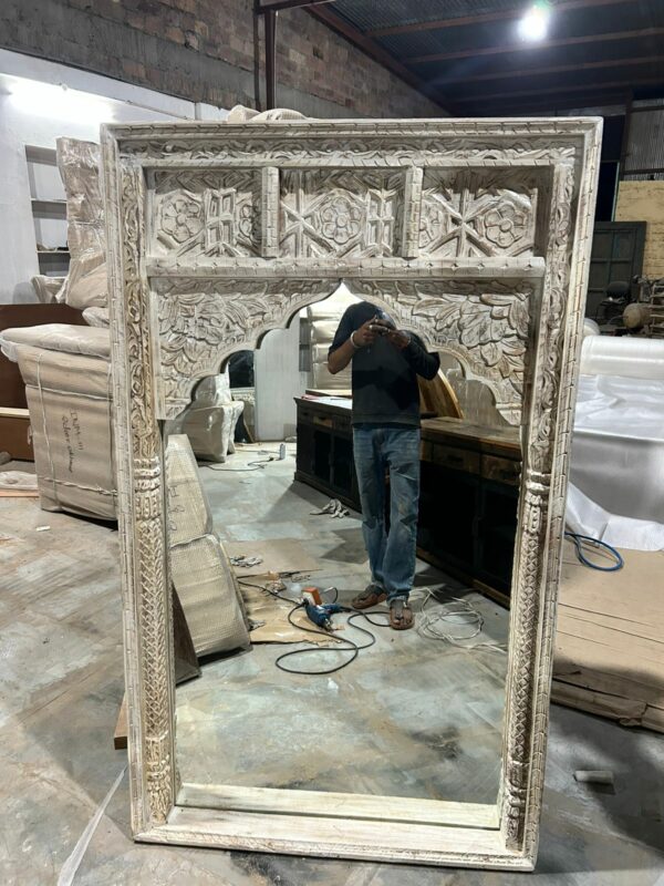 La finition blanche patinée accentue la beauté des détails et confère au miroir une allure à la fois rustique et chic.