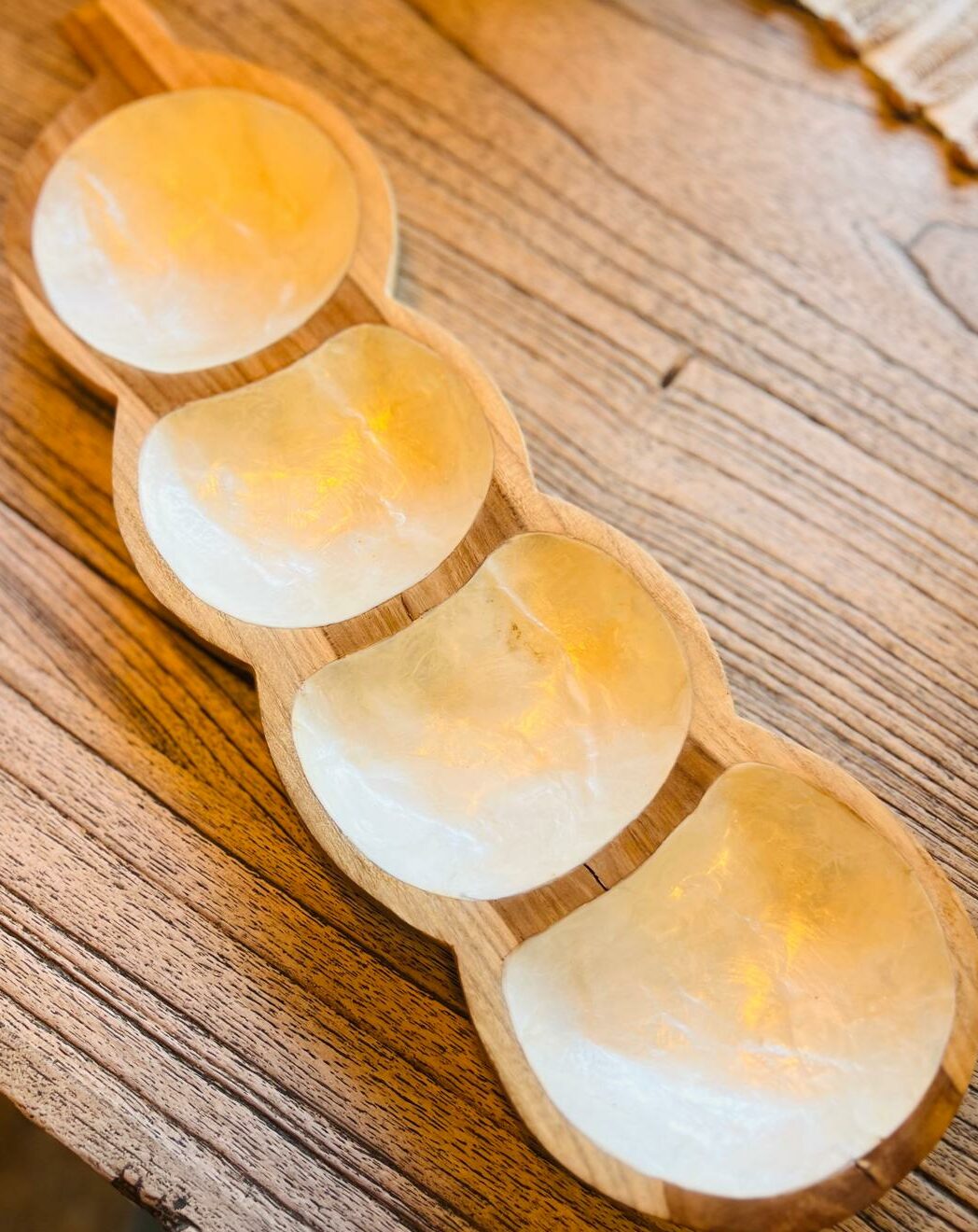 Apportez une élégance naturelle à votre table avec ce magnifique plat de présentation sculpté dans le teck. Cette pièce unique se compose de quatre compartiments arrondis délicatement incrustés de nacre aux reflets irisés. Ce mélange de matières nobles reflète parfaitement l’artisanat authentique de Bali pour une décoration de table raffinée. C’est l’accessoire de service idéal pour présenter vos apéritifs ou vos bijoux avec un style bohème chic. Laissez-vous séduire par ce mariage parfait entre la chaleur du bois et la brillance organique des coquillages.