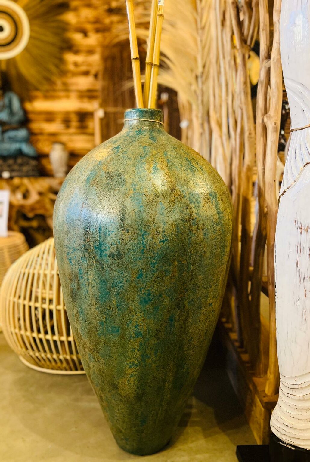 Apportez une élégance intemporelle à votre espace avec cette jarre en fibre de ciment de Bali. Tout d’abord, ce vase majestueux se distingue par sa patine nuancée de vert et d’ocre, offrant un aspect antique très recherché. En effet, chaque pièce est issue d’un travail artisanal fait main réalisé par nos artisans balinais avec un savoir-faire unique.
