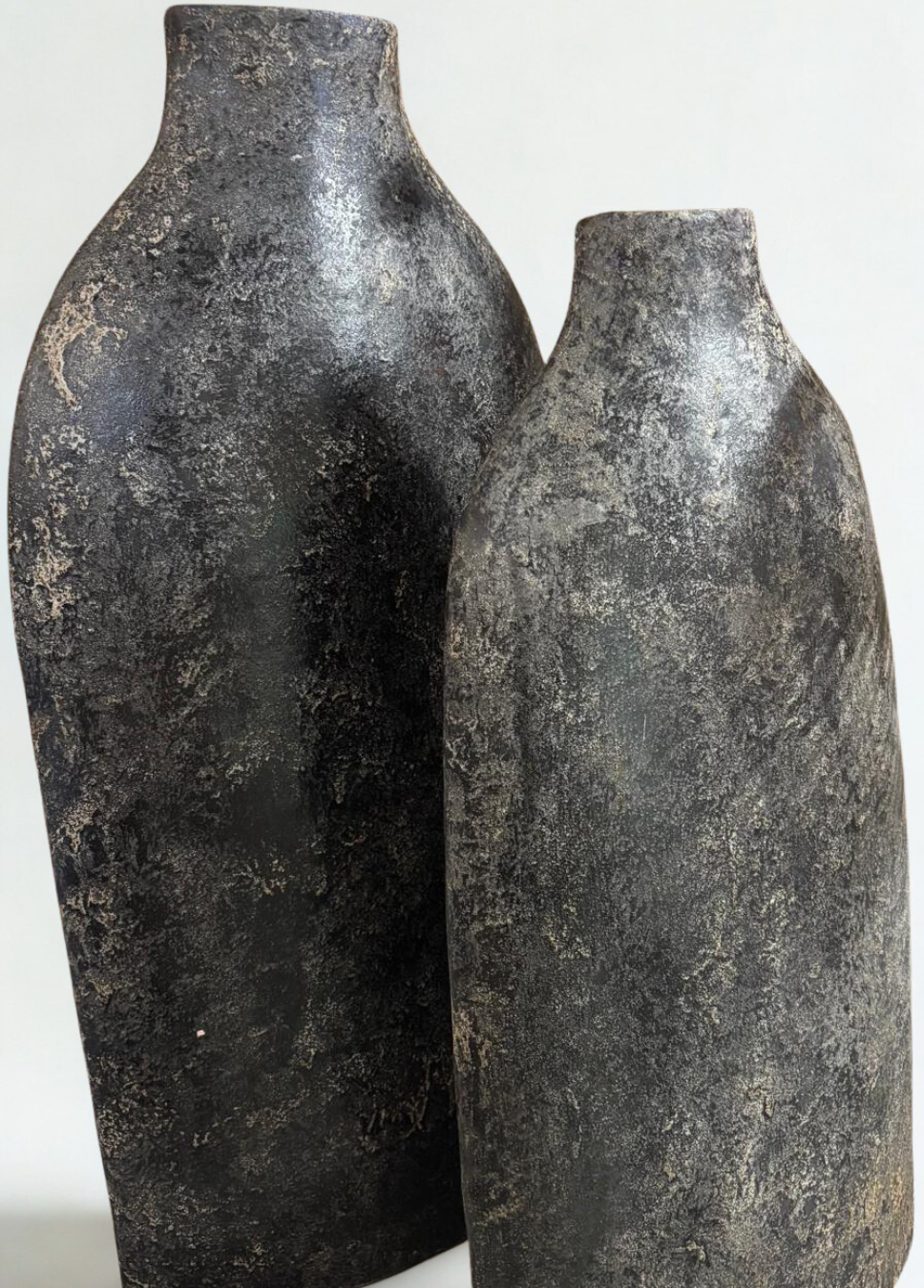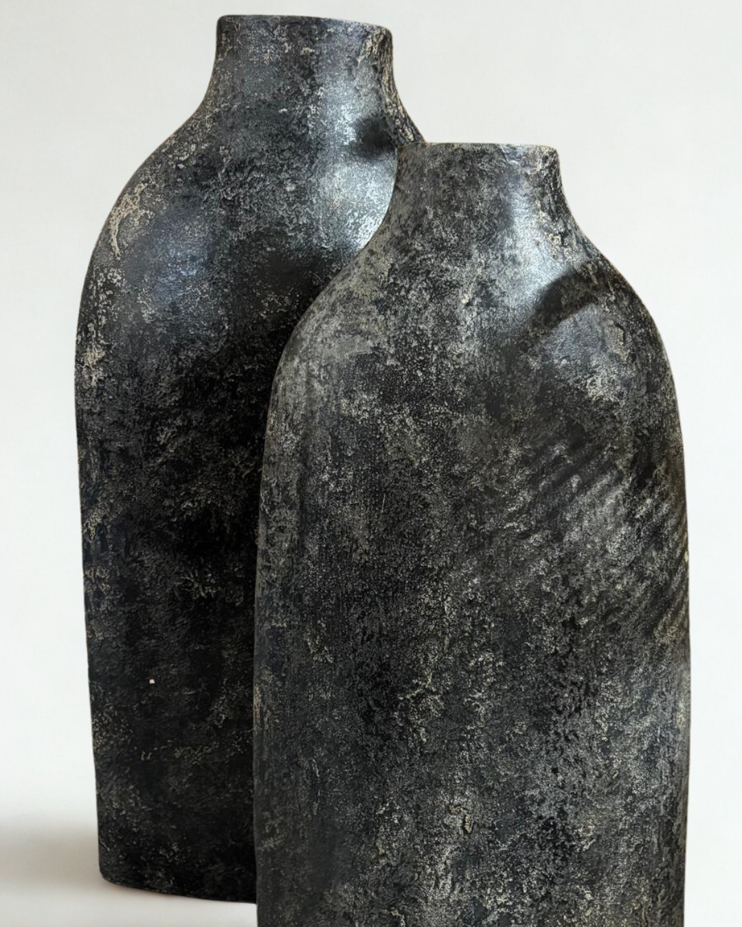 Cet ensemble de jarres en terre cuite se distingue par sa finition minimaliste d’un gris doux. Leurs formes organiques et leur texture naturelle confèrent un style chic et sobre. Idéales pour créer une composition élégante sur une terrasse, un meuble, ou pour mettre en valeur de grandes herbes de la pampa. Elles sont l’incarnation de l’élégance discrète.