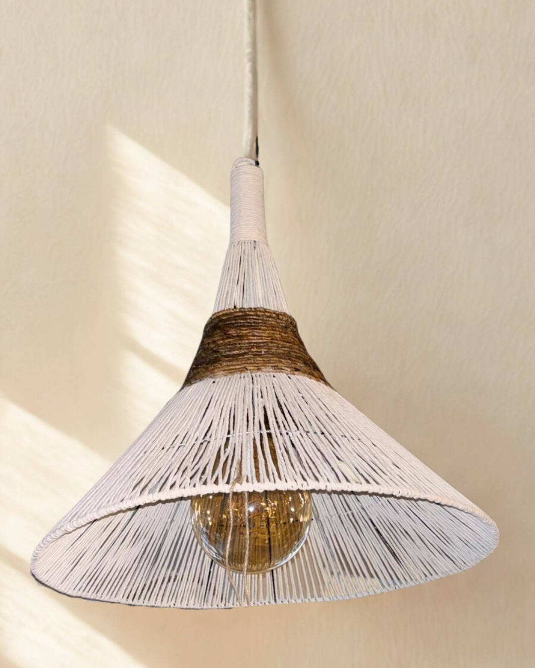 Adoptez cette suspension conique au charme naturel et raffiné. Façonnée à la main, elle se distingue par sa base en feuille de bananier tressée de couleur chaude, contrastant avec le tressage en fibre claire. Une pièce forte qui apportera une lumière douce et une élégance bohème à votre intérieur.