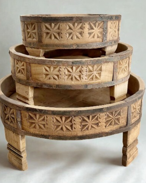 Connue sous le nom de chakki cette table basse atypique et originale (ou bout de canapé en bois exotique) est issue de l’artisanat traditionnel Indien.